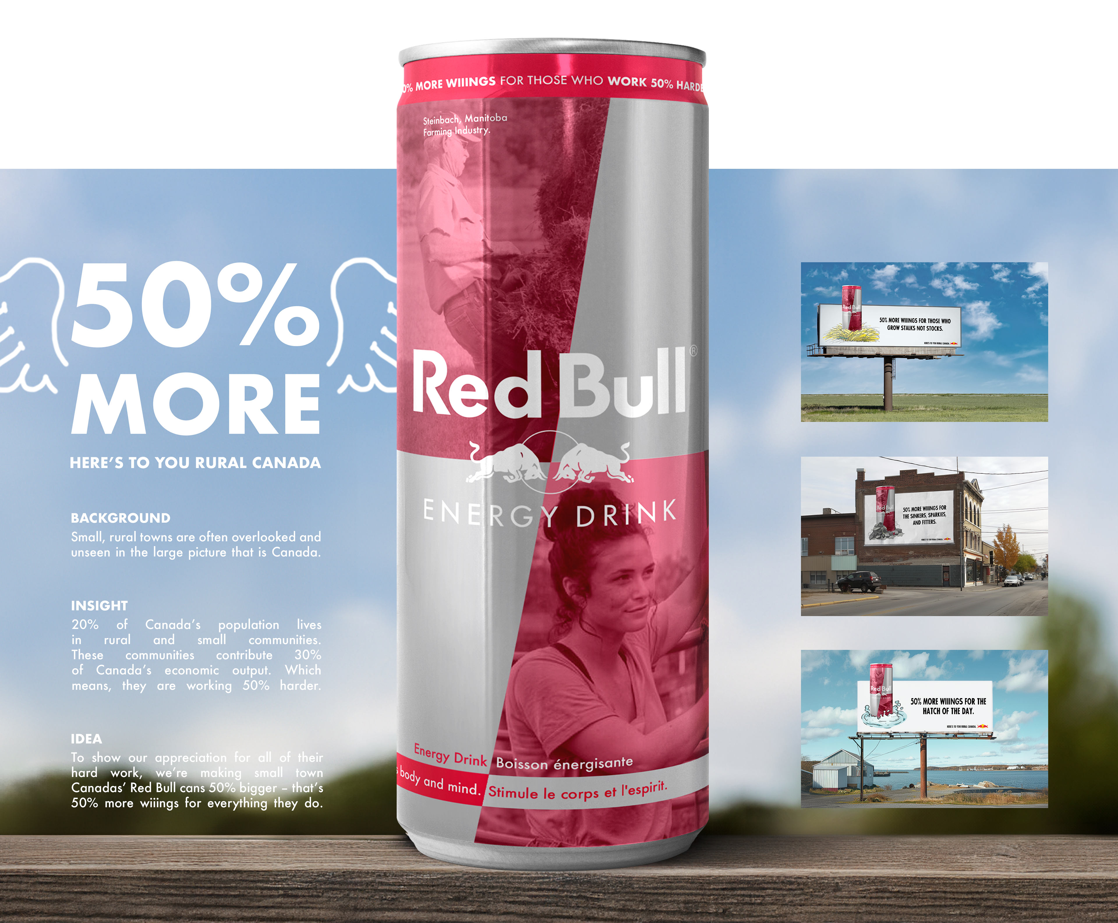 IDEA: To show our appreciation for all of their hard work, we're making small town Canadas' Red Bull cans 50% bigger - that's 50% more Wiiings for everything they do.